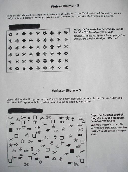 Die Klasse glaubt, dass sie die Modellzeichen genügend analysiert hat, um die Aufgabe lösen zu können. Ich teile das Aufgabenblatt aus. Die 5 Modellzeichen sind schwarz übermalt.